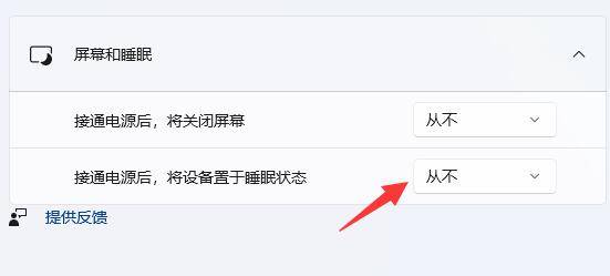 第六步,展开“屏幕和睡眠”,将下面两个选项都改为“从不”即可。