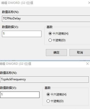 在带有DhcpIPAddress值的项下新建2个DWORD(32位系统)值 TcpAckFrequency 和 TCPNoDelay ,并把这两个值的数值数据均改动为 1 。