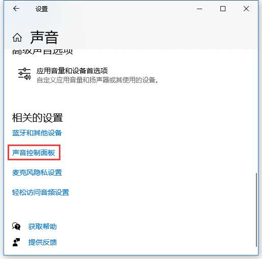 2、声音设置窗口中,点一下有关的设置下的声音控制面板;
