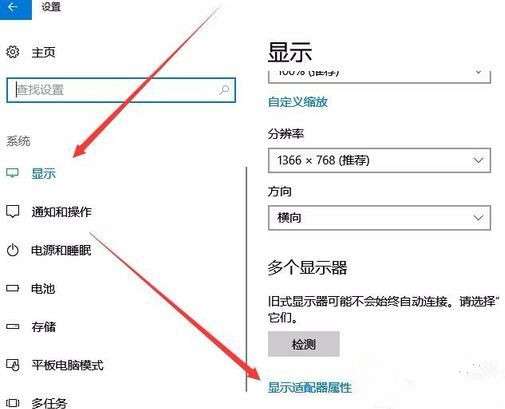 3、在开启的Windows系统设置窗口中,点一下左侧栏的“显示”菜单项,在右边窗口中点一下“显示电源适配器属性”便捷连接。