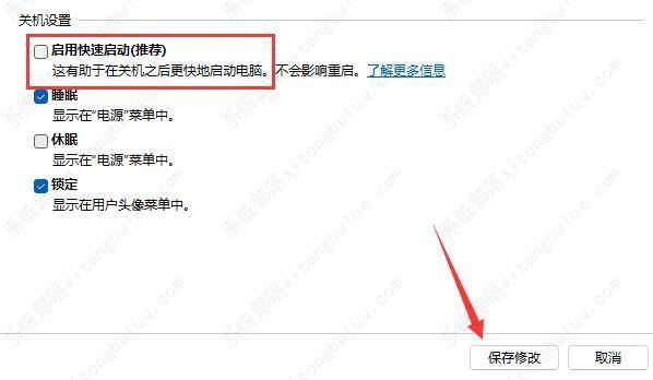 4、将“关机设置”下方的“启用快速启动”前面框框里的勾去掉,点击保存修改即可。