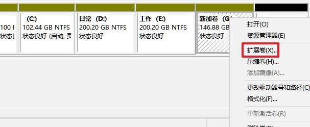5、对于还未分配的空间,也能选择它并进行分区,在选中的分区上右击,选择“扩展卷”即可。