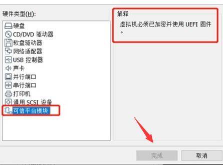 4、点击“可信平台模块”,再点击“完成”将它添加到虚拟机中。