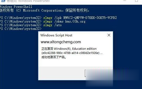 2.依次执行下面的命令,分别表示安装 Windows10 企业版密钥,设置 kms 服务器,激活 Windows10 企业版;